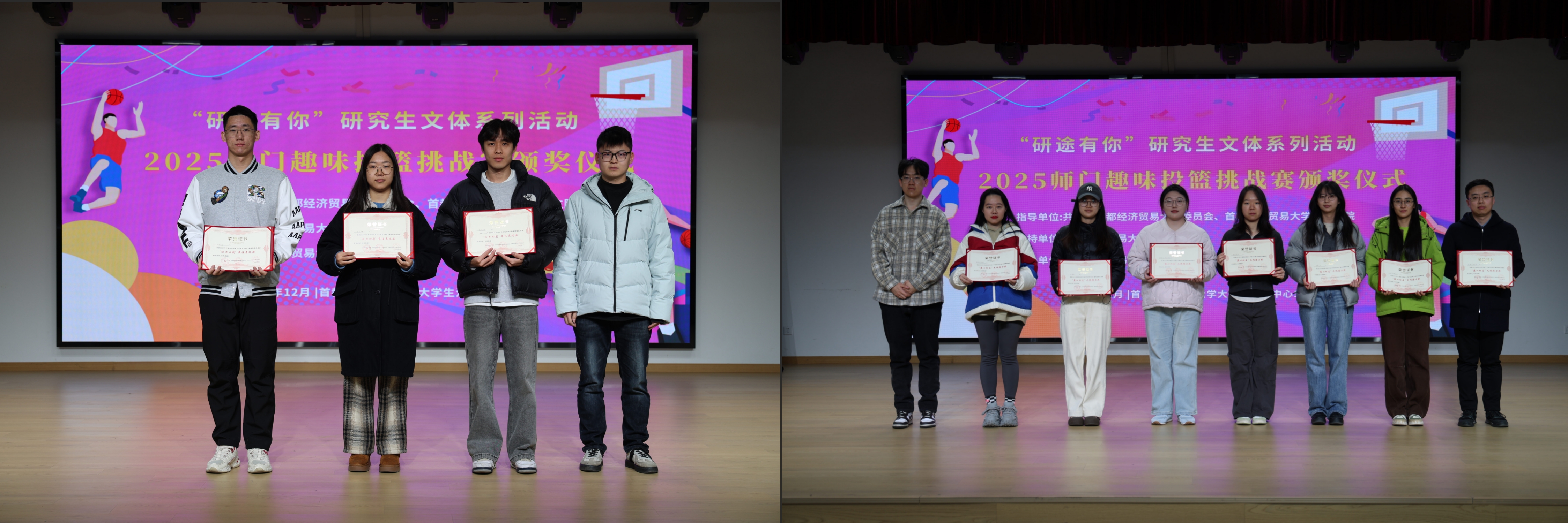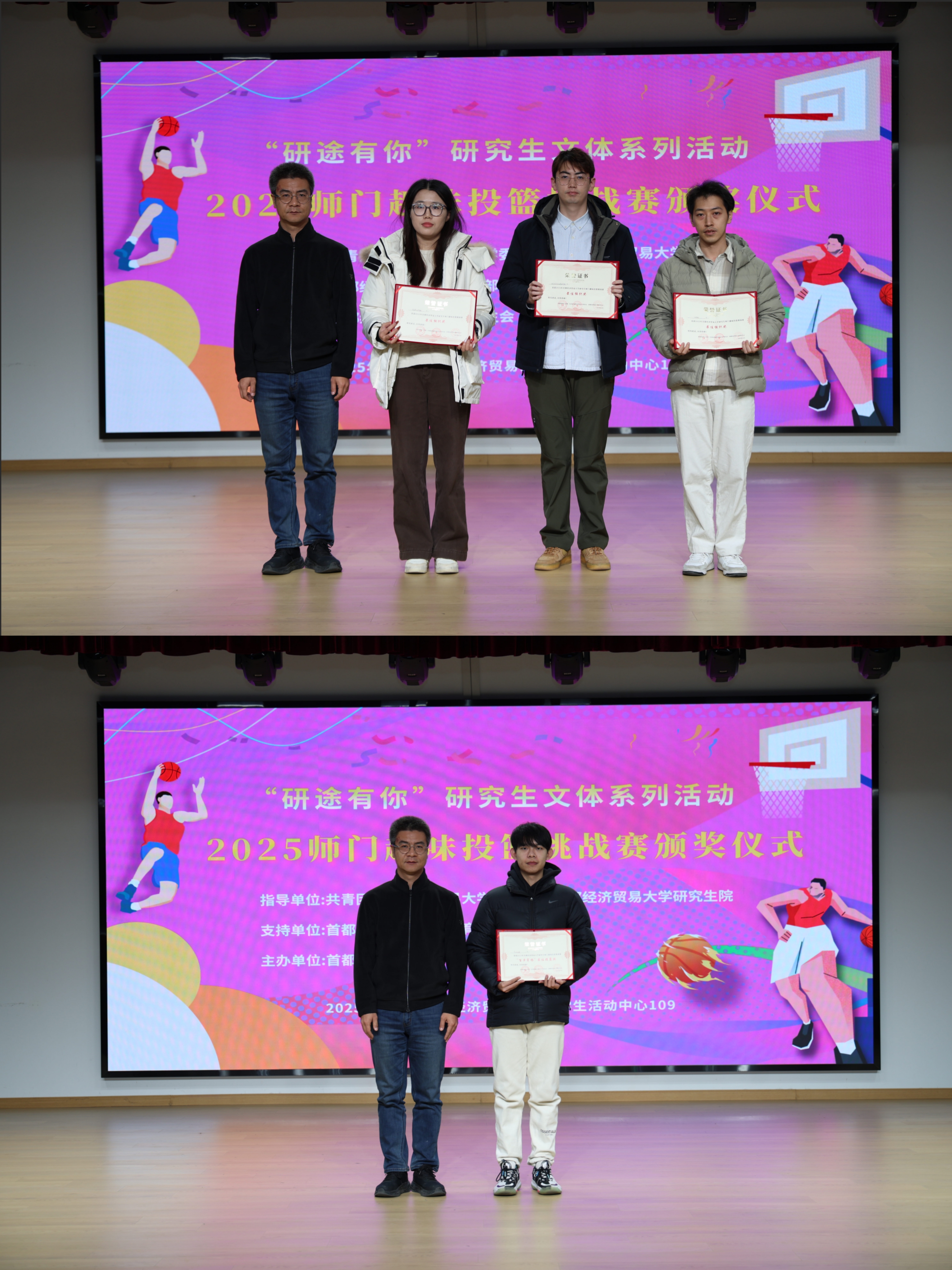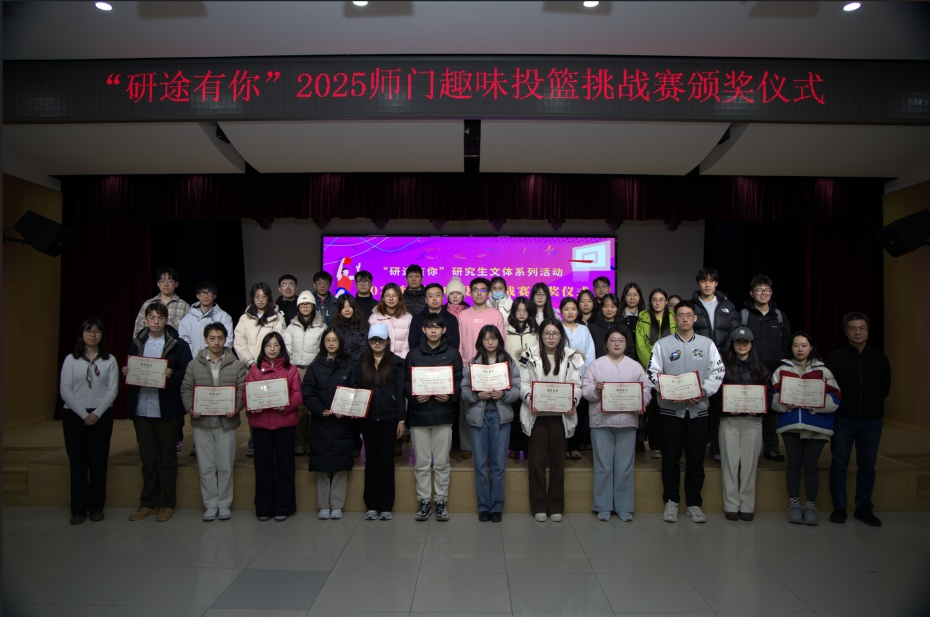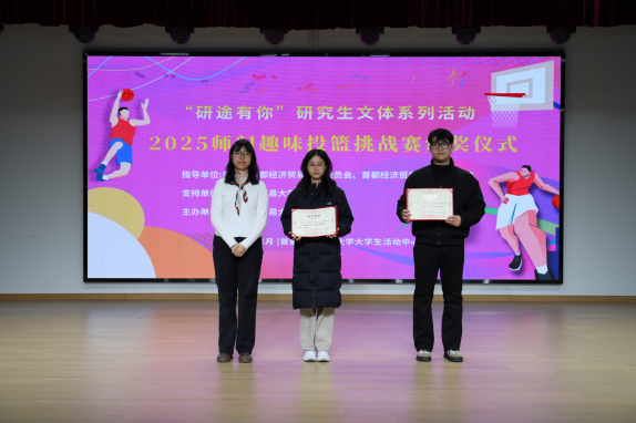 12月5日,首都经济贸易大学“研途有你”研究生文体系列活动之2025年师门趣味投篮挑战赛颁奖仪式在大学生活动中心109举行,校团委书记胡文、党委研究生工作部副部长冯汐与获奖团队师生共同出席活动。