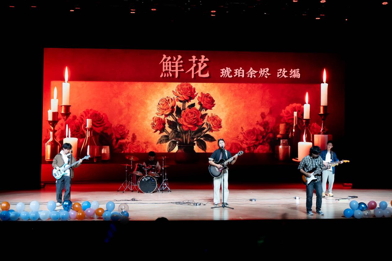 紧接着,琥珀余烬乐队以一曲《鲜花》为全场注入了满满的感动与力量。这首歌不仅是对过往的致敬,更是对全体新生即将展开的人生新篇章最真诚的祝愿。祝我们未来的道路,永远开满鲜花!更惊喜的是,这只乐队由来自三个不同学院的新生组成,因共同的热爱而相识、相知、相聚在全新的校园。